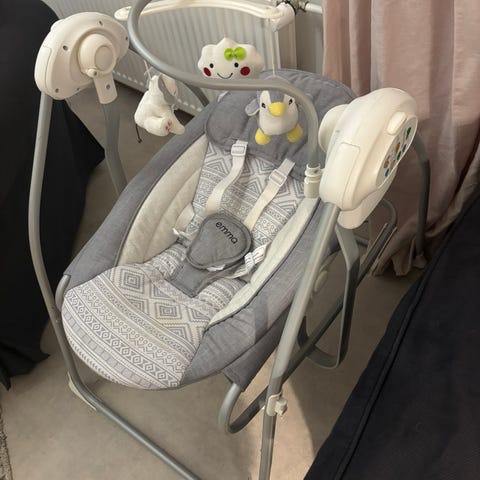 Todella vähällä käytössä ollut emma vauvakeinu. Keinuu ja soittaa musiikkia sekä värinätoiminto auttaa rauhoittumaan esim koliikkivauvaa. Linkki enenmän tietoihin. https://www.lastentarvike.fi/kotiin/vauvakeinut/emma-vauvakeinu-delight.html