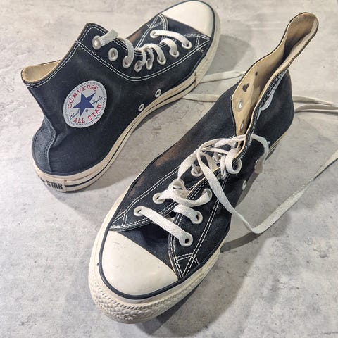 Converse Chuck Taylor All Star korkeat tennarit, koko 40. Mustat kangaspintaiset kengät, joissa valkoiset nauhat ja kumipohja. Soveltuvat monipuoliseen käyttöön ja vapaa-ajan urheiluun.