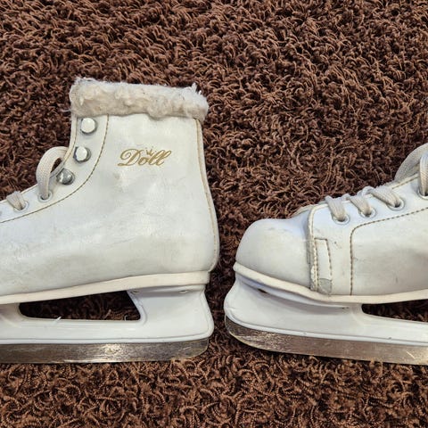 Lasten luistimet koko 32, mutta suosittelen n. 30 kokoiselle jalalle, jos vertaa normaaliin ulkokenkään. Ja haluaa villasukan mahtuvan. Väri valkoinen. Terät teroitettu jossain vaiheessa. Ei ruostetta. Luistimet ehjät, mutta jonkin verran elämää nähneet.