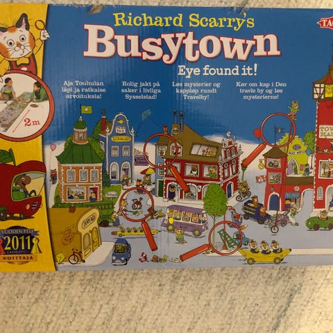 Richard Scarry's Busytown lautapeli, sisältää pelilaudan, pyörivän numerokiekon ja pelinappuloita. Sopii lapsille, kehittää lukemaan oppimista ja numeroiden tunnistamista.
