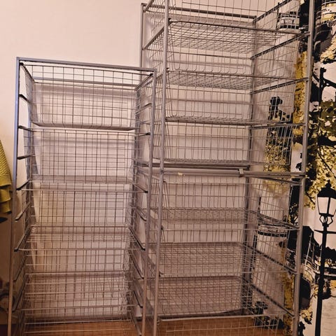 Hyväkuntoiset 180cm korkeat Elfa koritelineet ja 3kpl koreja. Korien leveys 45cm
