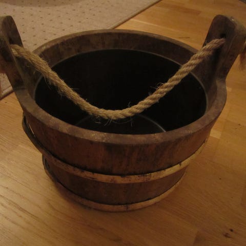 Saunakiulu, löylykauha ja laudeliina (130×45) joka ei ole ollut käytössä.