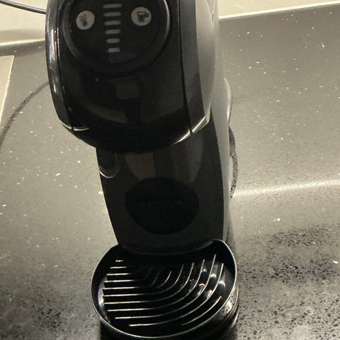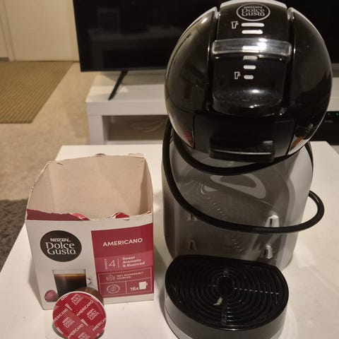 Nescafé Dolce Gusto kahvikone musta. Laite on suunniteltu kapselikahvien valmistukseen ja siinä on veden säiliö takana. Kompakti koko sopii keittiön tasolle. En tiedä mikä malli, hyvin toimii mutta ei ole ollut paljolla käytöllä. Kaikki huomioitu hinnassa.