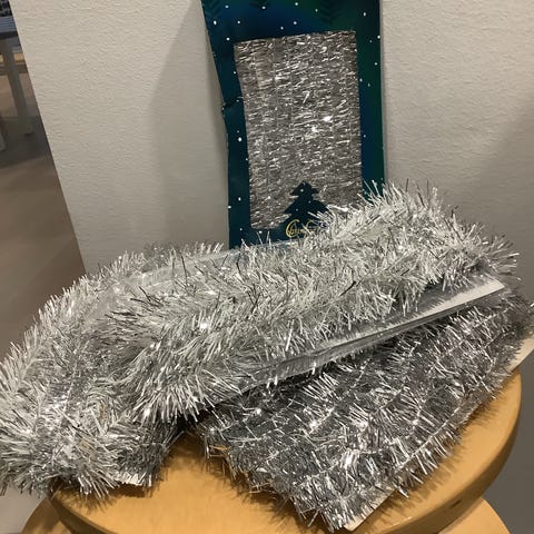 Kaksi valkoista, kimaltavaa joulukuusen nauhaa. Yksi nauha yli 2m pitkä. Nouto Pappilasta.