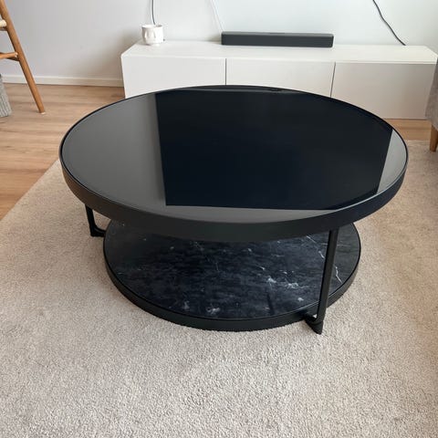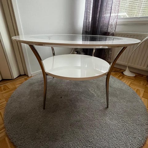 Myydään tyylikäs pyöreä sohvapöytä savunvärisellä lasitasolla. Pöytä sopii hyvin moderniin tai skandinaaviseen sisustukseen. Metallijalat (kullan-/messinginsävyiset) tekevät pöydästä tukevan ja näyttävän.