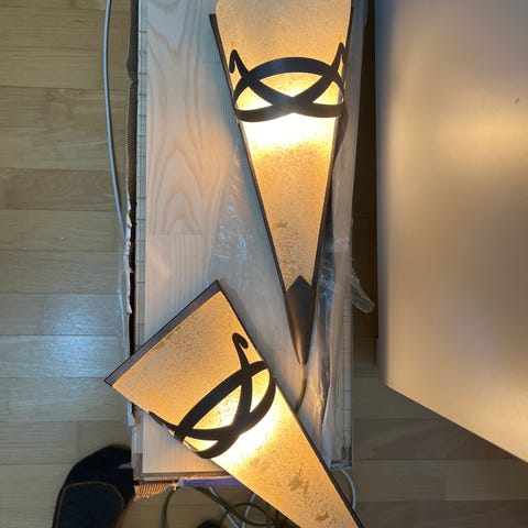 Myydään 2kpl Lampukas valaisimia. 80-/90-luvun klassikkovalaisin, joka sopii seinään tai kattoon. Molemmat ehjiä. Maali hieman rapissut metaalireunuksesta. Yleisilme siisti. Pallon halkaisija n.18cm, korkeus n.23cm.