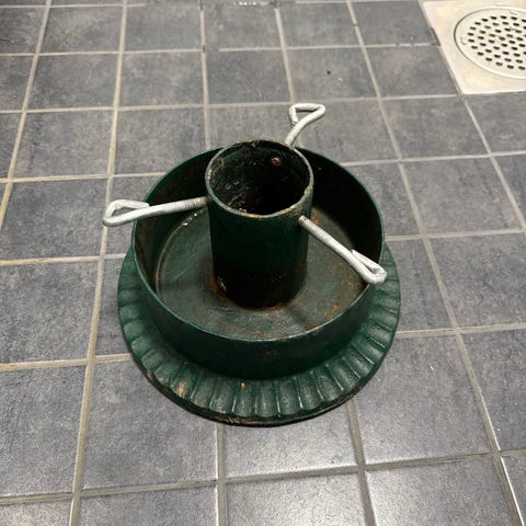 Ison kuusen jalka, muovinen. Yksi ruuvi saattaa puuttua tuosta kohtaa mihin kuusen jalka tulee. Käyttämätön.