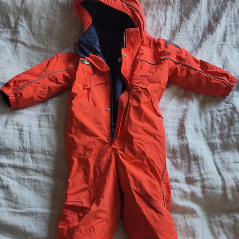 Käytön jälkiä ja kulumaa pinnassa löytyy. Toisesta hihansuusta tikkaus vähän pettänyt. Jalkalenkit puuttuvat. Meillä jäi köytöstä juuri pois ja perus ulkoilussa päikyssä piti kosteuden vielä ulkona. Koko 86, mutta on solakampaa mallia ja alkoi käydä naftiksi 86cm lapselle.