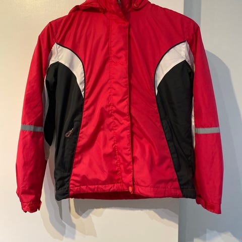 Punainen ulkoilutakki vetoketjulla. Ei huppua. Kaksi taskua.