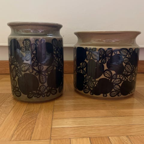 Vanha Arabia säilytyspurkki 'Salt'. Korkeus 14 cm, leveys 13 cm, syvyys 10 cm. Posliinin pinta krakeloitunut ja pieni lohkeama etupuolella (katso viimeinen kuva).