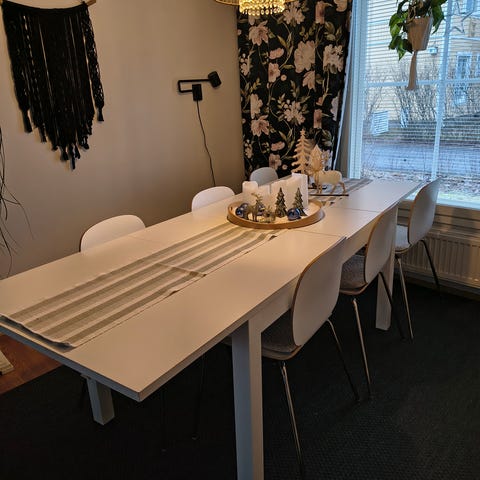 Myydään siistissä kunnossa oleva Ikean jatkettava ruokapöytä (tuolit eivät kuulu kauppaan). Nopea kauppa isomman pöydän tullessa meille jouluksi.
