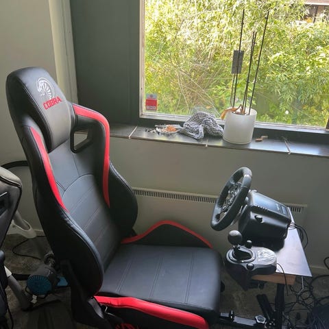 Logitech g 29 ratti ja polkimet sekä Logitech driving force vaihdekeppi. Playseat evolution ajosimulaattori.