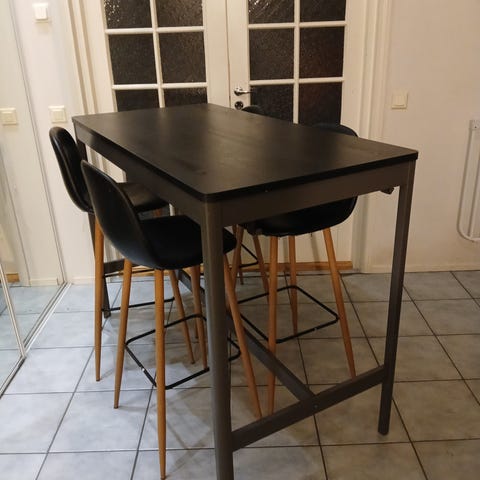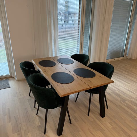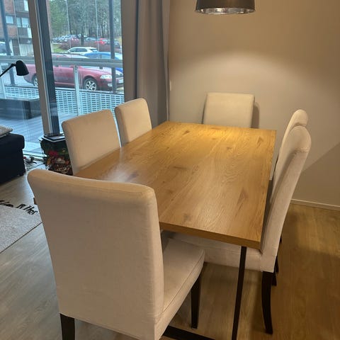 Hyväkuntoinen ruokailuryhmä. Nouto ja käteinen. En voi lähettää tuotetta. Neljä tuolia 360 €, pöytä 100 €. Koko ruokailuryhmä 460 €.