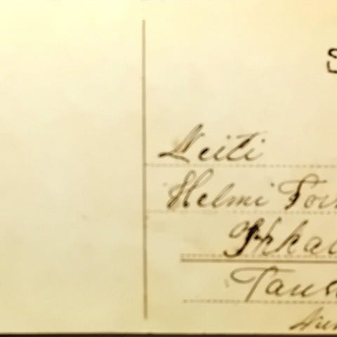 Hieno normaalia pienempi nyrkkipostilla kulkenut kortti. Materiaali guttaperka