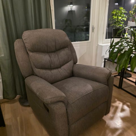Muhkea nojatuoli, jossa on todella mukava istua. Tuoli on osa Pohjanmaalla valmistettua mallikalusteryhmää, joka on ostettu 25 vuotta sitten Iskusta. Kaluste on rakenteeltaan ja kankaaltaan täysin ehjä lukuunottamatta kahta saumarepeämää plyysikankaassa (kts. kuva 3, toisella puolella istuinta samassa kohdassa samanlainen), jotka ovat tulleet lasten touhuissa. Ostajan on itse noudettava tuoli.