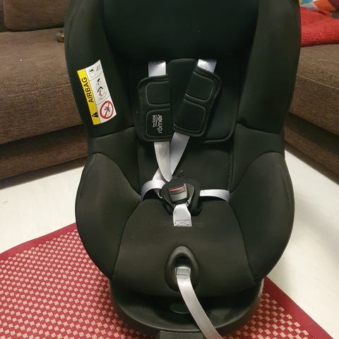 Britax Römer Dualfix-turvaistuin 0-18 kg (0-4v), käyttöjälkkiä on mutta istuimen kankaat ovat ehjät, yksi repeämä tuen textiilisuojassa (kuva). Kaikki mekaaniset toiminnot toimivat hyvin.