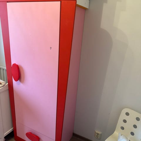 Kaappi hyllyillä. Ovissa pomppusalvat. Ehjä ja siistikuntoinen