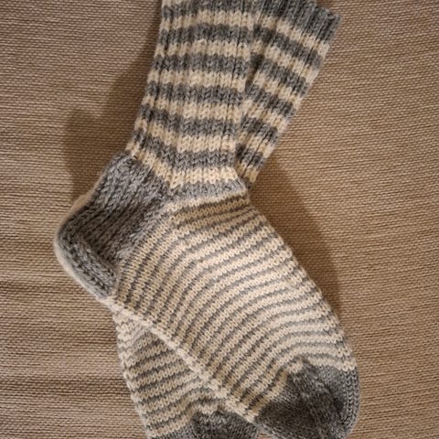 Marttojen ohjeella kudotot villasukat, joissa kaksiväriset kantapäät. Lankana Novitan 7 veljestä.