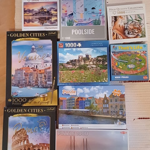 Myydään viisi palapeliä, 1000-palaisia, palat pussitettu ja kaikissa palat tallella.