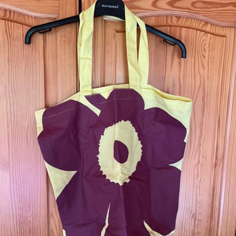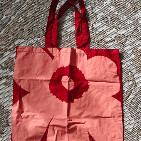 Marimekko kangaskassi, unisex-malli. Materiaali kangasta, jossa Marimekon tunnusomainen kukkakuosi punaisella ja mustalla vaalealla pohjalla.
