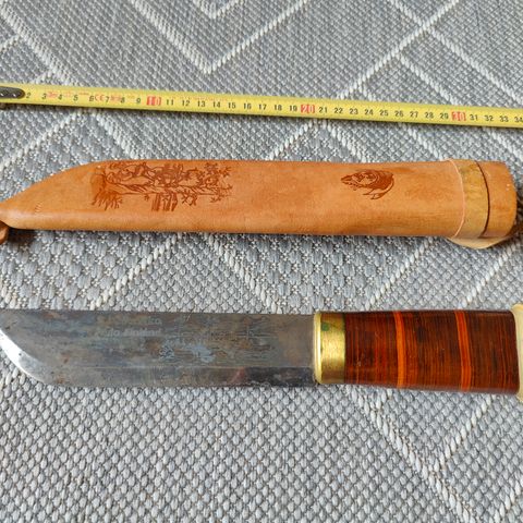 Mitat: Puukko tupessa 22,5 cm, puukko 21,5 mm, kahva 13 cm, terä 8 cm.