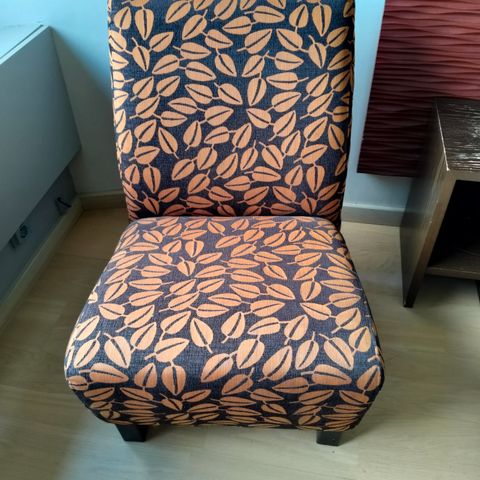 Päällinen vahvaa kangasta. Puinen kehikko ja jalat.