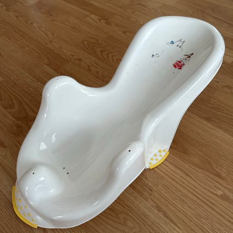 Yhdellä vauvalla ollut kylpytuki. Vain kuva on kulunut tuessa. Hyvä imukuppi pitää tuen ammeessa paikoillaan. Voi kiinnittää vaikka seinälle kuivumaan.