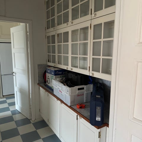 Annetaan Etu-Töölössä myymälätiski, Takana hyllytasoja.