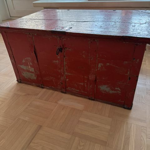 Kaunis pinkki puuarkku. Tilava säilytykseen ja kaunis kotia koristamaan. Arkku on painava, mutta helppo siirrellä kun alla on pyörät.