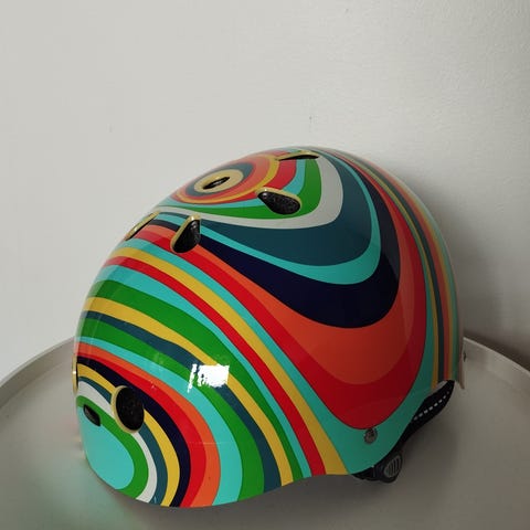 Uutena ostettu ja yhden lapsen käytössä ollut valkoinen Warp-kypärä pyöräilyyn tai esimerkiksi skeittailuun. Koko M/L (56–58 cm).