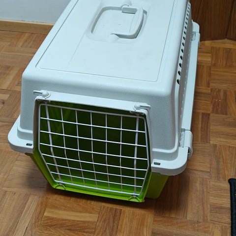 Kuljetusboksi muovinen, värit sininen ja beige. Soveltuu lemmikkien kuljetukseen. Käytetty kissan kuljettamiseen.