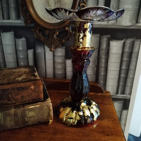 Upea designlasia. Kynttilänjalka kolmella kirkkaalla ikkunalla.
