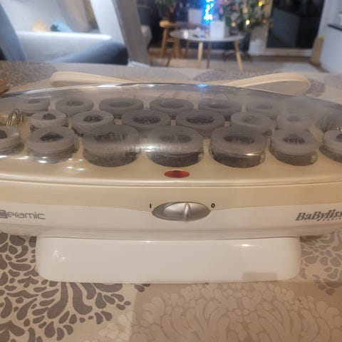 BaByliss Volume Curl hiustenmuotoilija sisältää useita lämpörullia eri kokoisina ja tarvikkeita. Käytetty ehkä kymmenen kertaa. Toimiva ja siisti.
