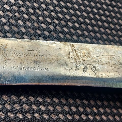 Isoimmassa tuohikahva,saamipuukossa poronluuta hinnat vasemmalta 20€ 20€ 15€