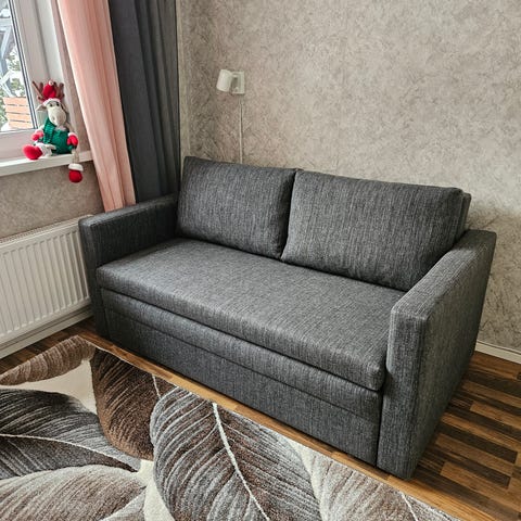 Hyvässä kunnossa oleva ja ryhdikäs kahden (tai 2,5) istuttava ruskea vuodesohva. Merkki Bellus. Pestävät päälliset. Helposti taittuva vuodemekanismi, jalat tosin tarvitsee hieman säätöä: vuode on jotenkin vinksallaan putkien taipumisen takia, edellisen omistajan jäljiltä. Vuoteen leveys 120 cm, erillinen patja mukana.