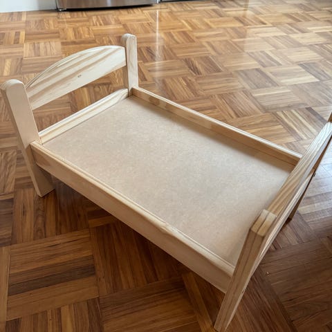 Nuken sänky, valmistettu puusta. Itse maalattu vaaleaksi ja lisätty patja, mukaan myös lakana, ohut tyyny ja peitto.