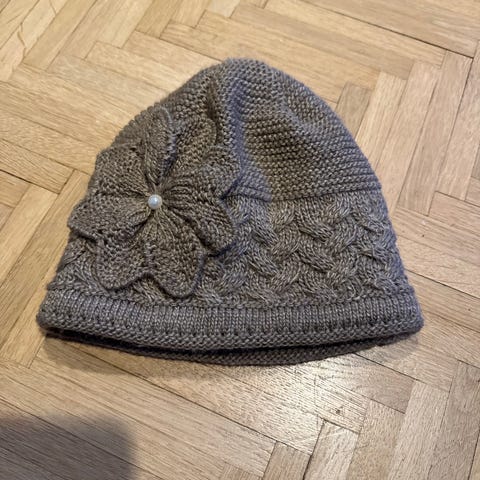 Käsintehty ruskea kukkakuvioinen neulepipo