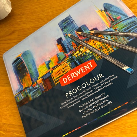 Kynät uudet/uudenveroiset, metallilaatikossa on jälkiä, kuvassa. Myynnissä myös värityskirjoja.
