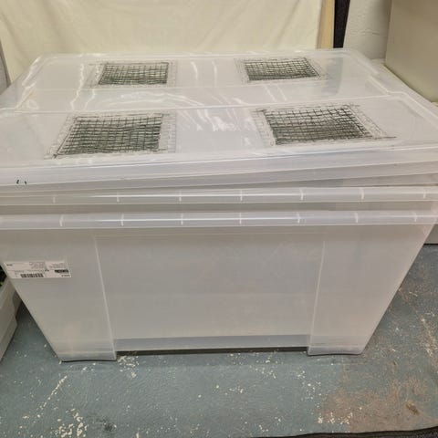 Ikean 130L Samlasta modattu lomakoti jyrsijälle. Irtoavassa katossa metalliverkkoa nippusiteillä kiinni. Pohjassa pyörät.