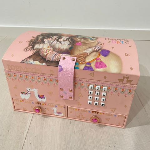 Koodilukollinen korurasia. Siisti, toimii, koodi vaihdettavissa. Soi avattaessa.