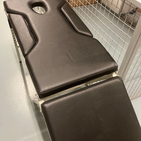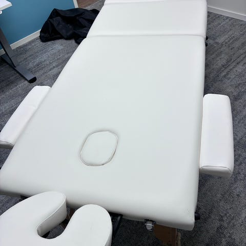 Sähkösäädettävä hierontapöytä vaaleanpunaisella verhoilulla. Pöydässä on useita osia, jotka mahdollistavat mukautetun asennon hierontaan tai hoitoihin. Soveltuu ammattilaiskäyttöön tai kotikäyttöön. Pöydän ylös/ alas suunta toimii, mutta keski sähkösäädössä vikaa. Pöytää ei ole aktiivisesti käytetty useampaan vuoteen.