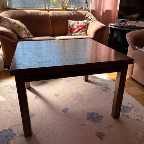Sopen valmistama Tower malliston tukeva sohvapöytä, joka yleisesti siistikuntoinen, pinnoilla käytön jälkiä. Design Kauko Porkka.
