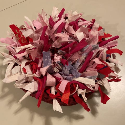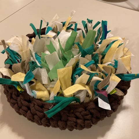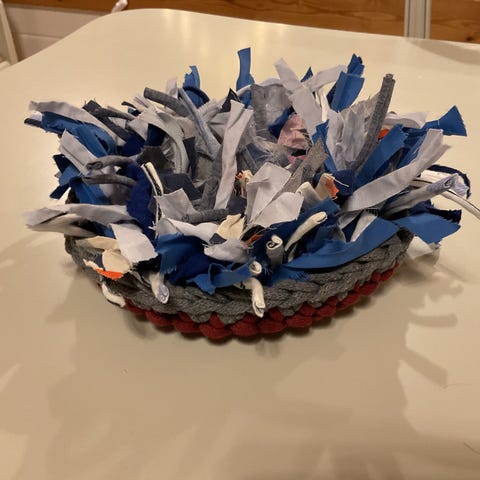 Nuuskukuppi/nuuskukori/aktivointikori….lemmikillesi. Koko: halkaisija noin 19-20 cm, korkeus ilman hapsuja noin 6 cm. Kori harmaa, hapsut sinisen eri sävyjä. Materiaali kierrätystrikoota ja -puuvillaa. Pesu 30/40 astetta.