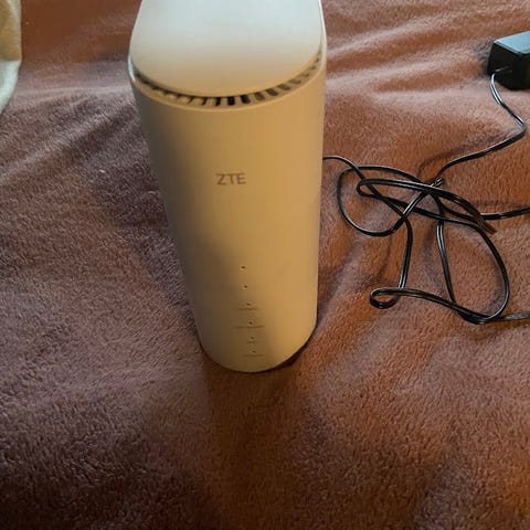 ZTE 5G reititin valkoisella värillä. Laite sisältää RJ45 LAN-IN ja PWR LAN-OUT liitännät. Reititin on tarkoitettu langattomaan internet-yhteyteen ja tukee 5G-verkkoa.
