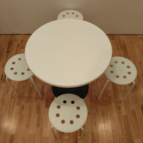 Myyn pöydän hintaan 100 euroa. Kuvissa mukana olevat jakkarat eivät sisälly hintaan, mutta voin myydä ne hintaan 20 euroa.