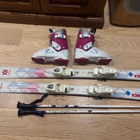 Myydään hyvässä kunnossa olevat 120cm sukset sekä monot 220-225