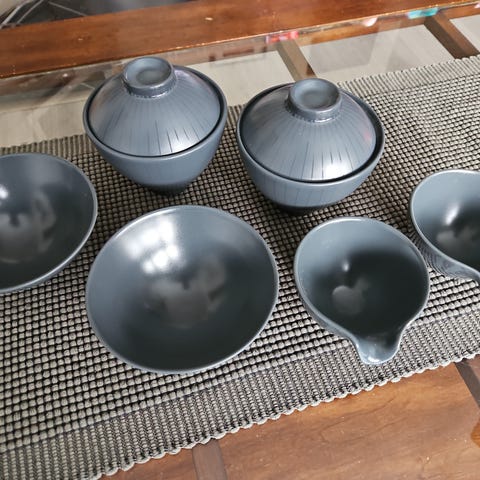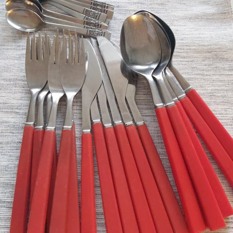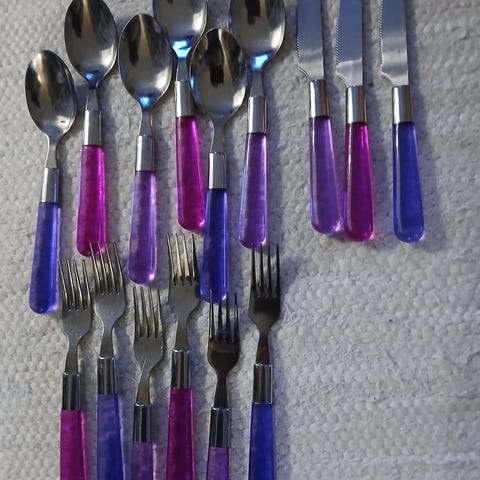 Korealaisia ruostumattomia aterimia; haarukoita ja veitsiä 5+5 kpl ja isoja lusikoita 2 kpl ja pikkulusikoita 2 kpl = 14 kpl. Hinta yhteensä 12 euroa.