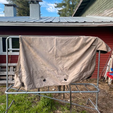 Ehjä loimi, vähän likaa. Toppaus n. 200g. Remmit ehjät, pitää hyvin sateen.