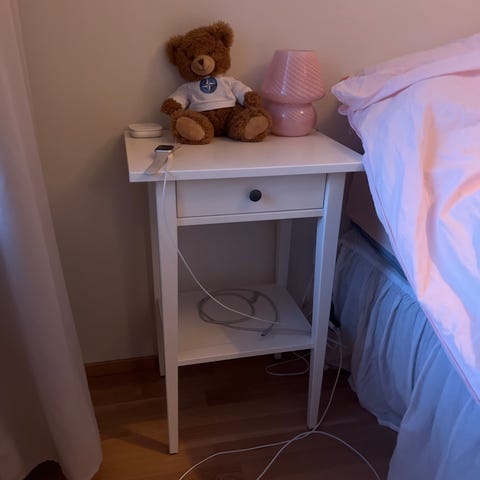 IKEA yöpöytä, väri valkoinen. Työpöydässä on kaksi laatikkoa , pieni lokerikko jotka tarjoavat säilytystilaa. Takajaloissa urat esim. latausjohdoille