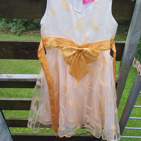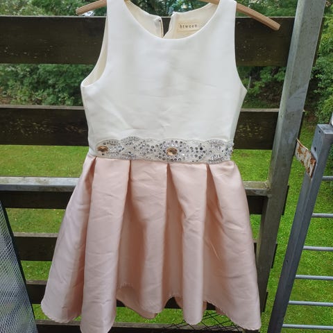 Myydään kerran käytetty ihana juhlamekko. Edessä ruusukkeita, takana rusetti.